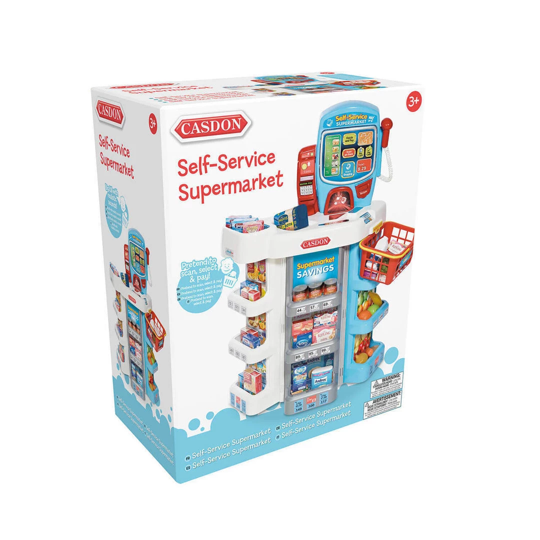 The fantastic Casdon Self Service toy Supermarket has been cleverly designed to copy the type of self service areas commonly seen in all of today’s modern supermarkets and local food shops.
