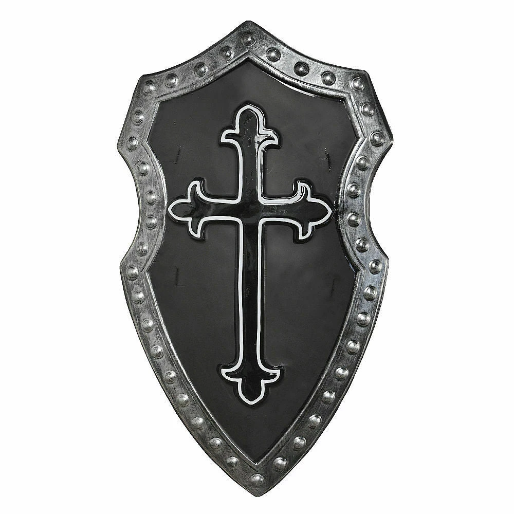 Defend your honor with a Black Cross Medieval Shield. This plastic shield features a matte black finish and a gothic cross symbol with a shiny finish and white outline. The border of the shield is accented with silver molded rivets. Attached black straps on the back make this shield easy to carry around all night. Complete your medieval knight costume with a Black Cross Medieval Shield!