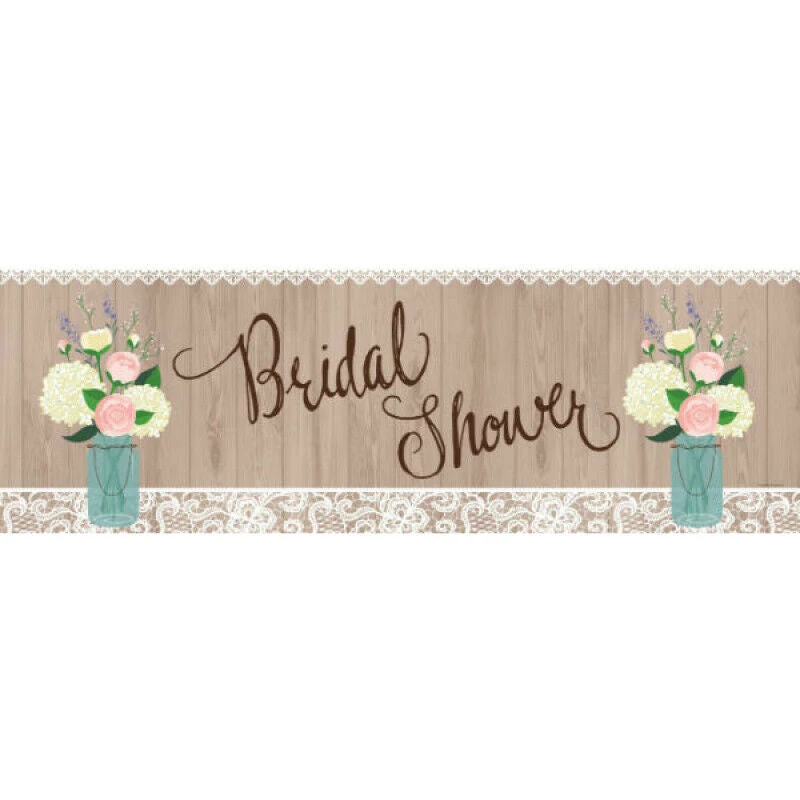 A Giant Rustic Bridal Shower Banner makes a big statement on your big day! This vinyl banner features the words “Bridal Shower” printed in cursive letters. A background of natural wood is accented by two wildflower bouquets in Mason jar vases and a vintage white lace pattern along the top and bottom. Hang this large bridal shower banner up at your indoor or outdoor venue with a ribbon, tape, or Sticky Tack (sold separately) for an instant touch of old-fashioned charm. Vinyl 51cm x 152cm & Eyelets Indoor or Outdoor Use