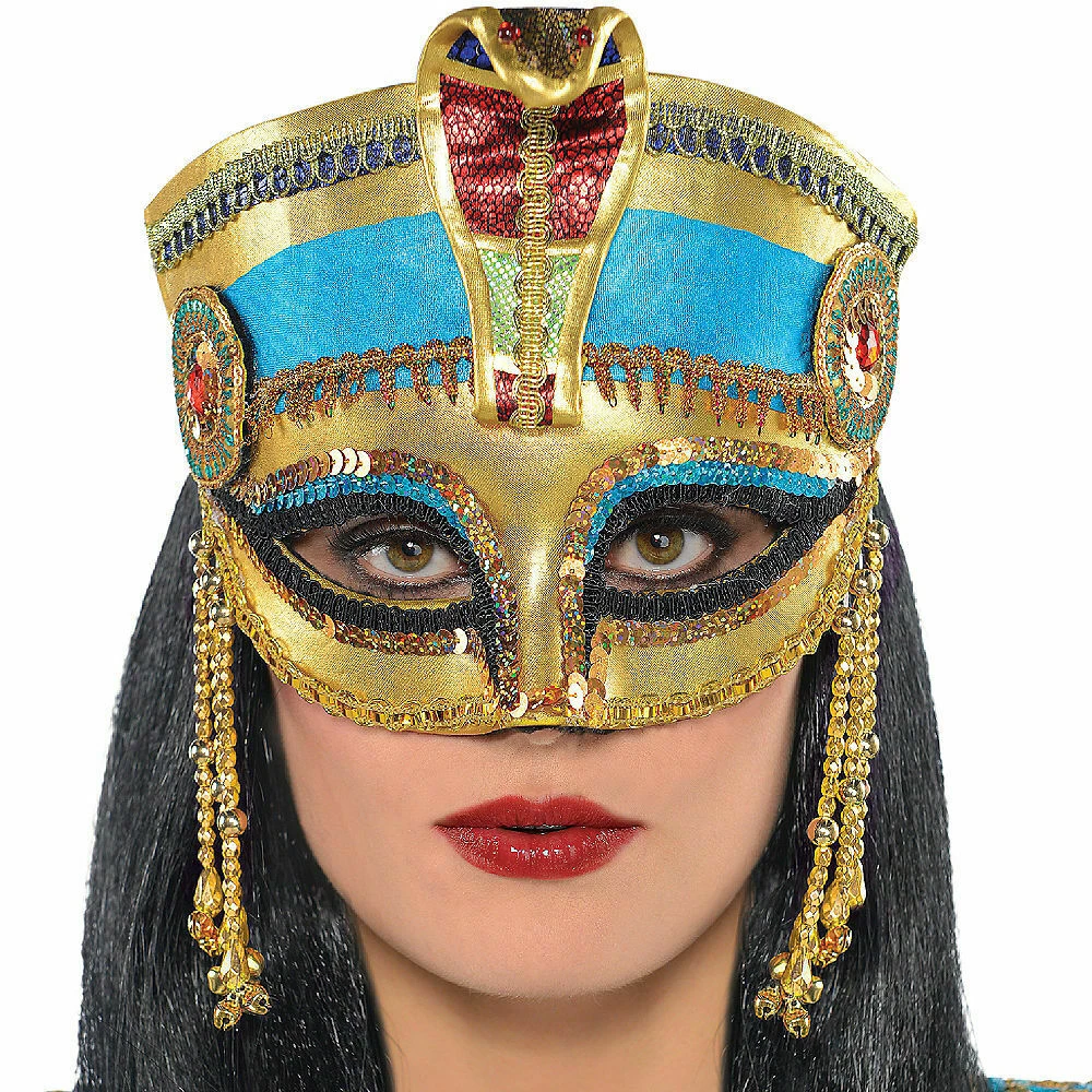 You’re as mysterious as a sphinx in an Egyptian Masquerade Mask! This eye mask features classic Egyptian styling, with a high, flat crown, a curved cobra head in the center, and sequin and faux gemstone detailing. Bold blue, red, and gold fabrics make it fit for the Queen of the Nile. An elastic band allows for a comfortable fit.