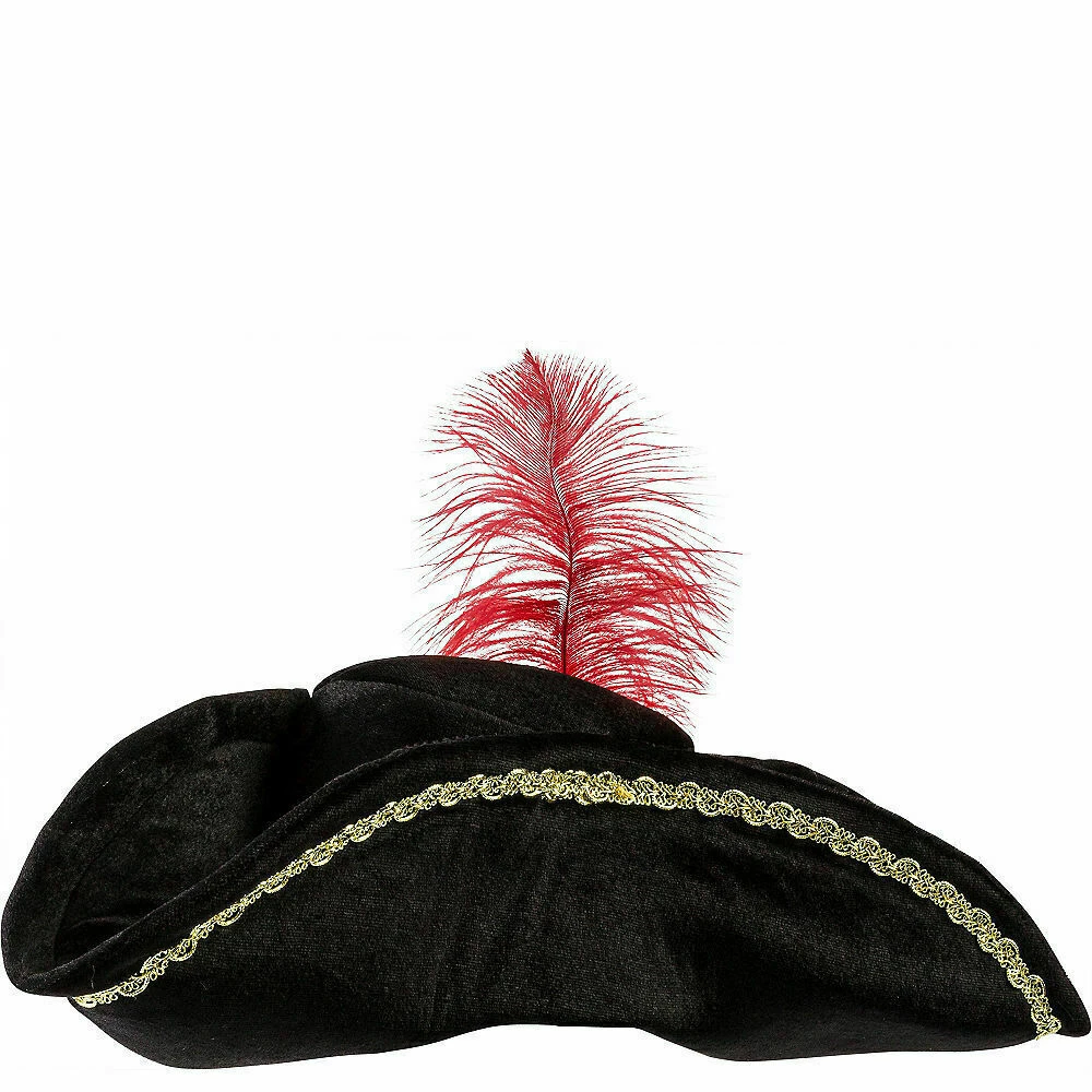 Swashbuckle in style with this elegant Pirate Hat. Black Buccaneer Pirate Hat features a formed velour three-cornered design with ornate gold trim and a red feather accent. Pirate Hat is 100% polyester. One size fits most adults.