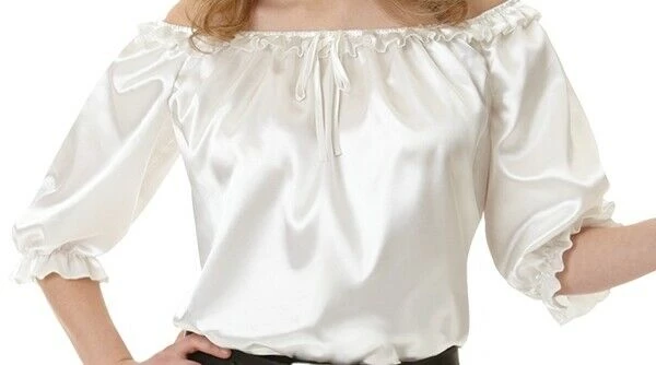 Take this Ivory Satin Pirate Blouse, for example: sexy and bare shouldered, ruffled around the elastic collar and sleeves, finished with a fetching bow, and sewn from gleaming, silky polyester satin. Eat your hearts out, pirate men! Wear this peasant-style pirate shirt as the foundation of your pirate costume. Blouse fits Size 10 -12