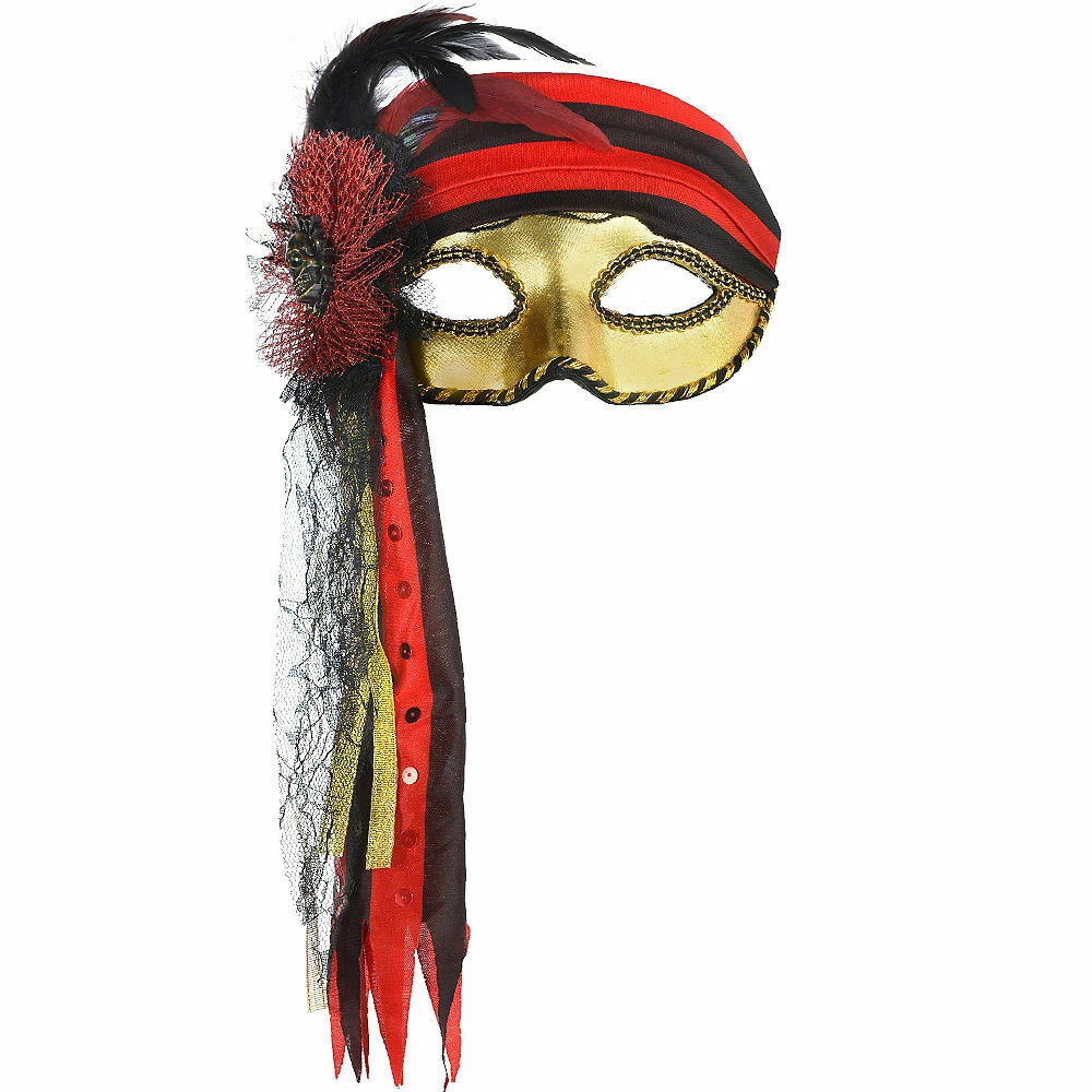 Masquerade as a high seas marauder! This Pirate Masquerade Mask instantly transforms you into a buccaneer babe. The gold, molded fabric face mask has black lace and sequin accents plus black and gold trim. The forehead is covered by a black and crimson striped pirate bandana that hangs down to one side.