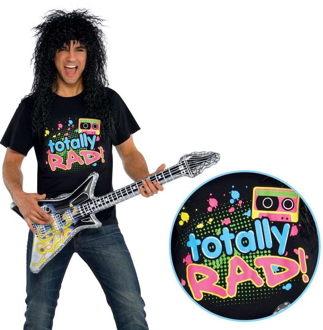 This black T-shirt features neon graphics of a cassette tape, “Totally Rad!” text, and paint-spatter details. Wear it to your next ’80s-themed party