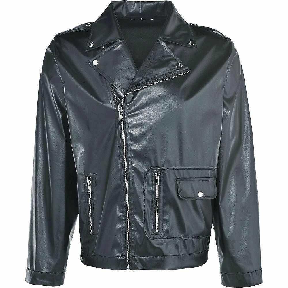 Get ready to hang out with the rest of the greaser gang at Rydell High School in a Grease T-Birds Leather Jacket! The black leather jacket features a white “T-Birds” logo on the back. Wear this jacket with jeans, a T-shirt, and boots (sold separately) to create your own greaser costume. Meet the rest of the T-Birds at the Frosty Palace in a T-Birds Leather Jacket! Shoes, wig, shirt, and pants not included.