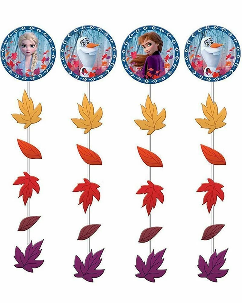 Elsa is back again and has teamed up with her sister Anna and friends on a grand adventure in the next upcoming Disney film Frozen 2. Celebrate the release of the new film and complete your Frozen 2 themed party with these Disney Frozen 2 Hanging String Decorations. The decoration features cardboard circle cutouts of Olaf, Elsa and Anna attached to a white piece of string, with an autumn leaf separating each circle. Hanging from each of the character cutouts is a string of 5 autumn leaves of different shapes and colours. Combine with our range of Frozen 2 party supplies including party cups, party plates, tablecovers and more.