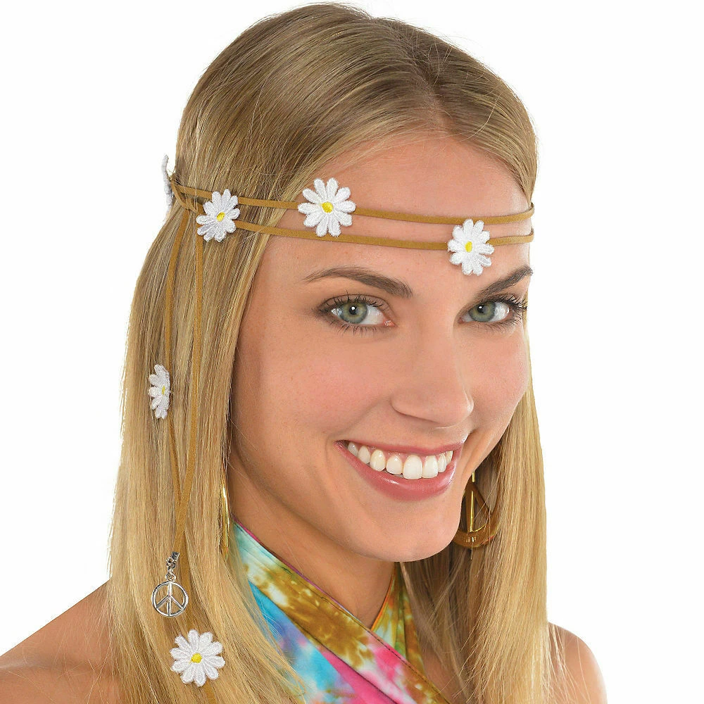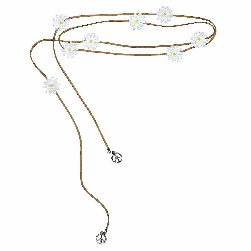 Sport cute festival fashion with our Festival Flower Headband! This groovy hair accessory features a suede cord with fabric daisy accents and peace sign charms that hang from each end. With an adjustable hook-and-loop closure, this hippie headband is a great accessory to a chic festival outfit or 60s costume! Festival Flower Headband measures 26in long, and fits most teens and adults.