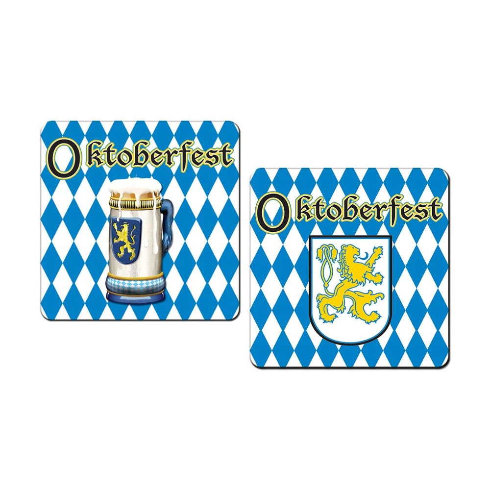 The Oktoberfest Coasters are printed in the traditional Bavarian blue and white checkered board print. The Oktoberfest Coasters are perfect to give as a keepsake party favor to give to each of the guests. The Oktoberfest Coasters come in a package of eight (8) coasters, assorted designs.Â