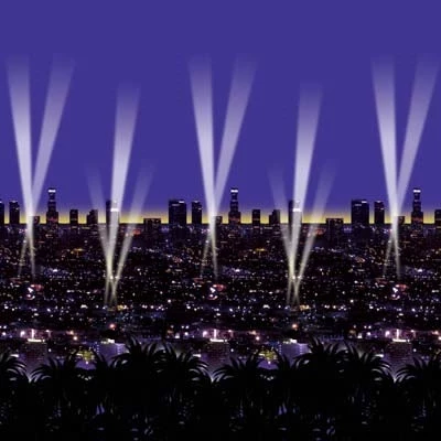 It has a city scape scene at the bottom of the backdrop with palm trees and city lights showcasing the night sky. There are white spot lights shooting up into the night.Â