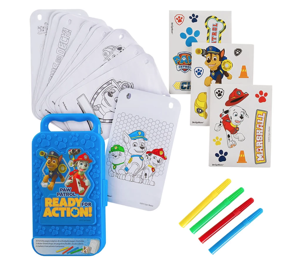 This blue plastic PAW Patrol Sticker Activity Box features Chase and Marshall on the front with paw print accents. Inside are 20 colouring sheets with all your favourite characters. Colour them in with the four included markers, then add some stickers for extra fun!