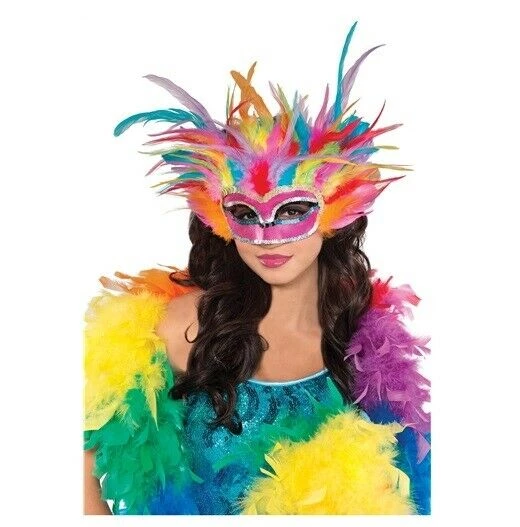 You’ll be the center of attention at your carnival themed masquerade or Halloween party with this tropical colored Rainbow Feather Mask!Â