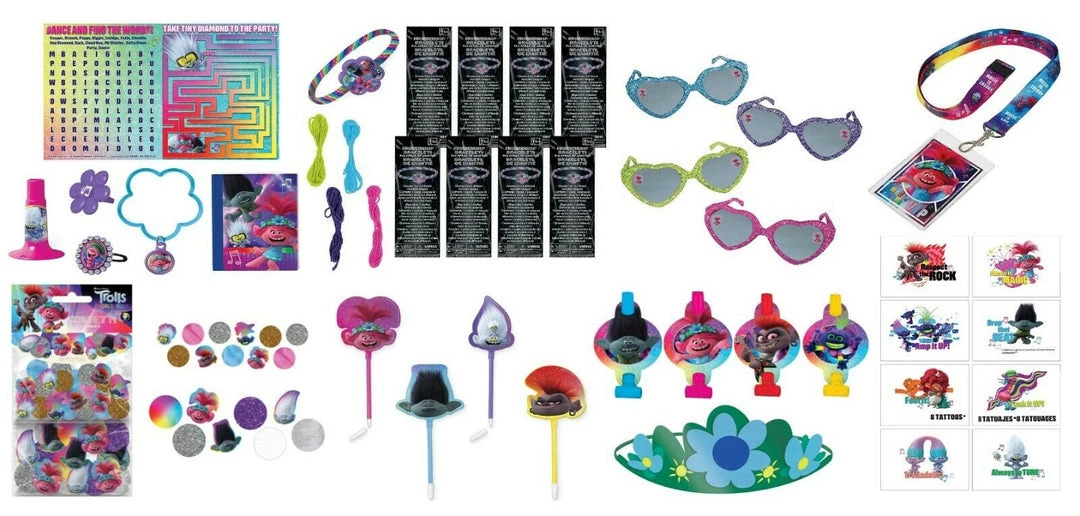 These party favors feature Barb, Poppy, Branch, King Trollex, and more, plus fun