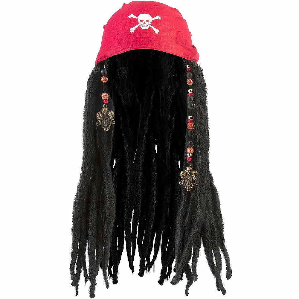 Aye Cap’n, ’tis a look to be “dreaded!” Our Pirate Bandana with Dreads features a red satin bandana with a white skull and crossbones print in front, and attached long black dreadlocks that that hang to the chest. Bead and jewelry details on either side add a dashing high seas touch. One size fits most teens and adults.