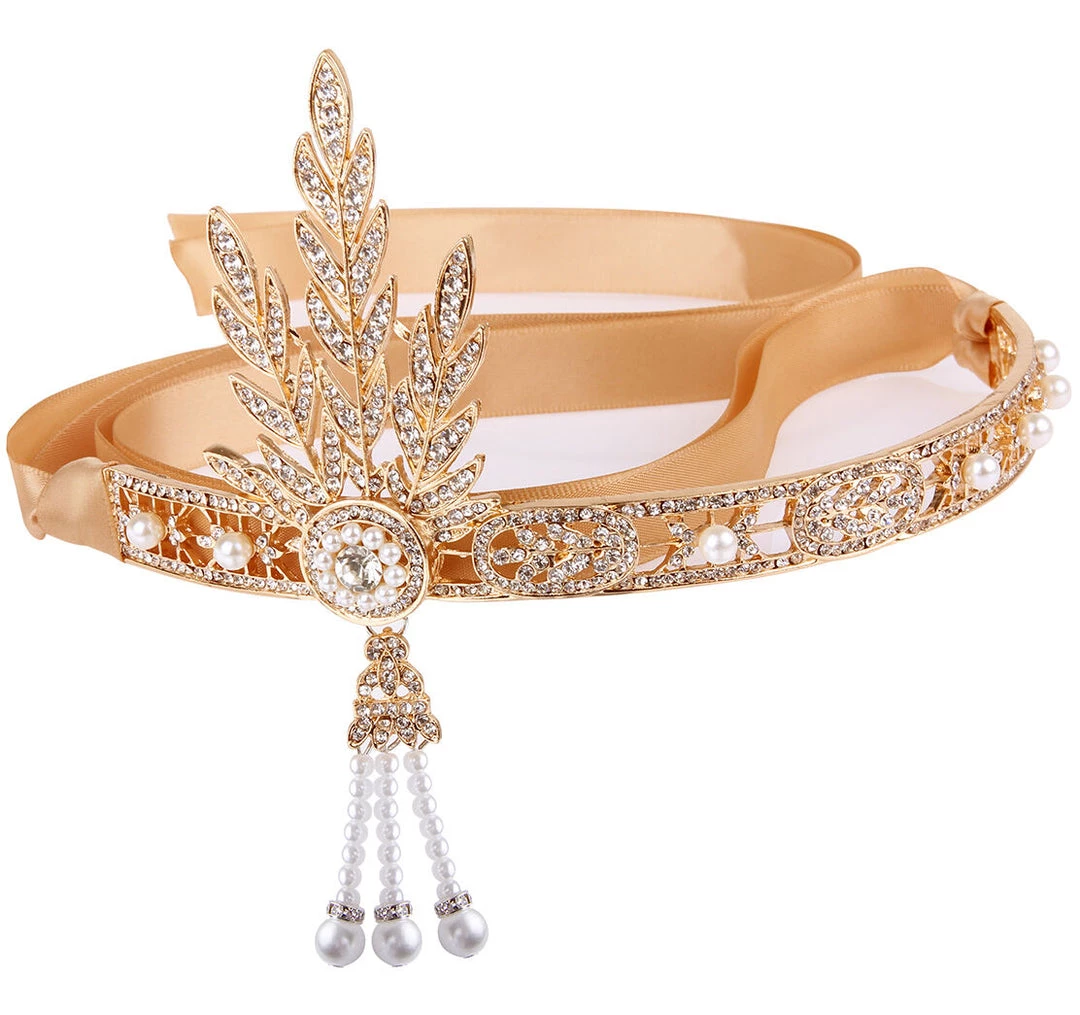 - Headband is made of satiny ribbon material with an ornate rhinestone appliqués and pearls on the front, this elegant headband adds a luxurious touch to any outfit.