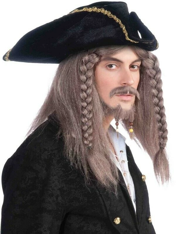 Shoulder length, wavy hair with an old school quiffed fringe that perfectly pokes out from under a Pirate Tricorn Hat. Hat Not Included