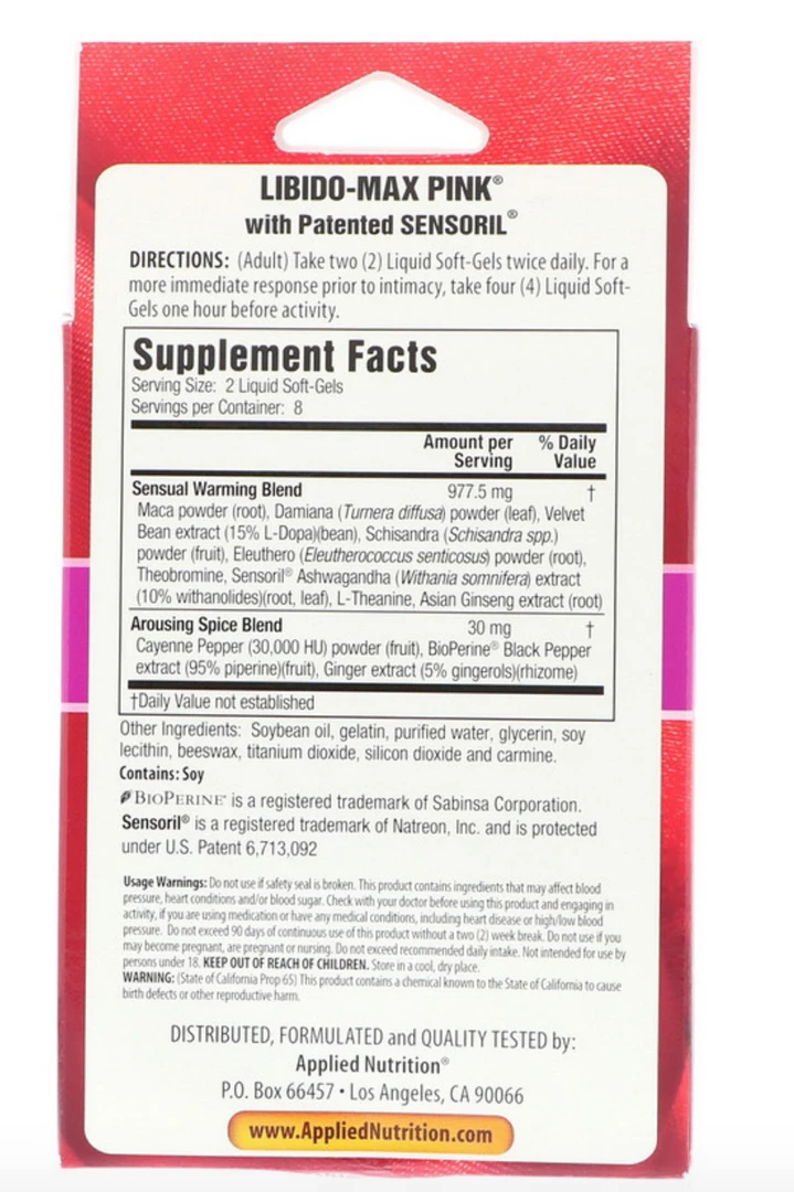 Sensual Warming Blend Maca powder (root), Damiana (Turmera diffusa) powder (leaf), Velvet Bean extract (15% L-Dopa)(bean), Schisandra (Schisandra spp.) powder (fruit), Eleuthero (Eleutherococcus senticosus) powder (root), Theobromine, Sensoril Ashwagandha (Withania somnifera) extract, (10% withanolides)(root, leaf), L-Theanine, Asian Gingseng extract (root). |