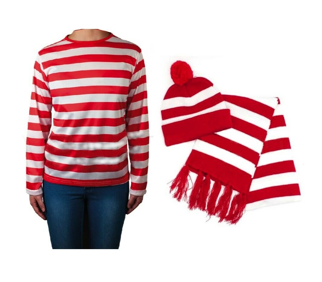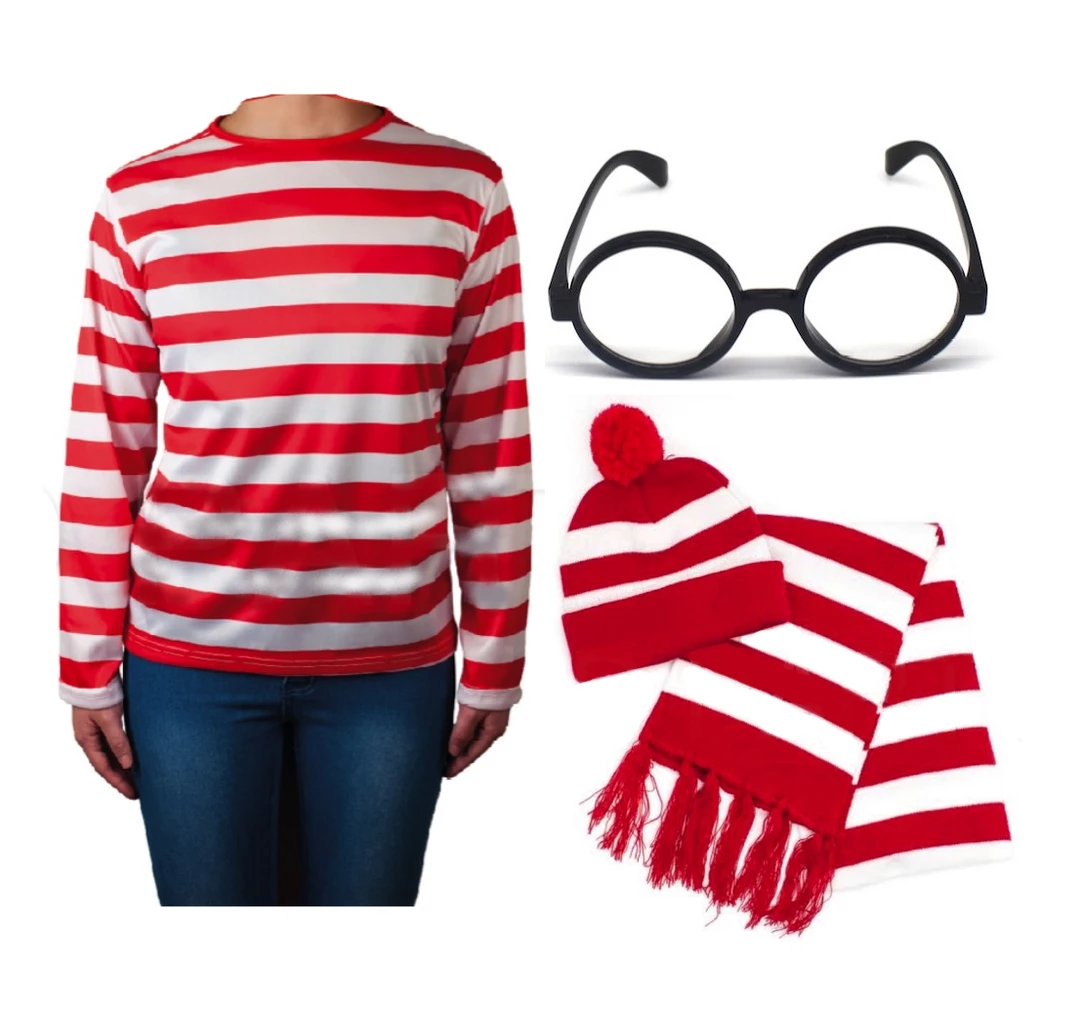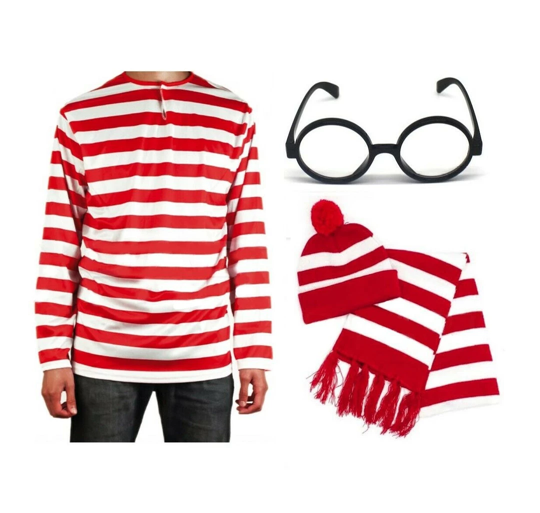 Look the part of everyone’s favourite Where’s Wally with these red & White striped costume sets. Shirt, Beanie Hat & Scarf and Glasses