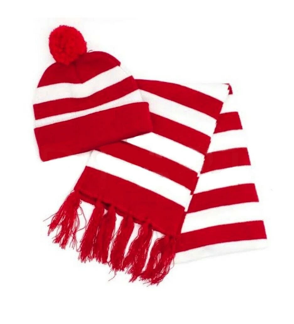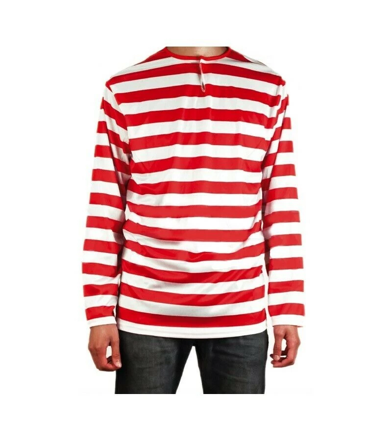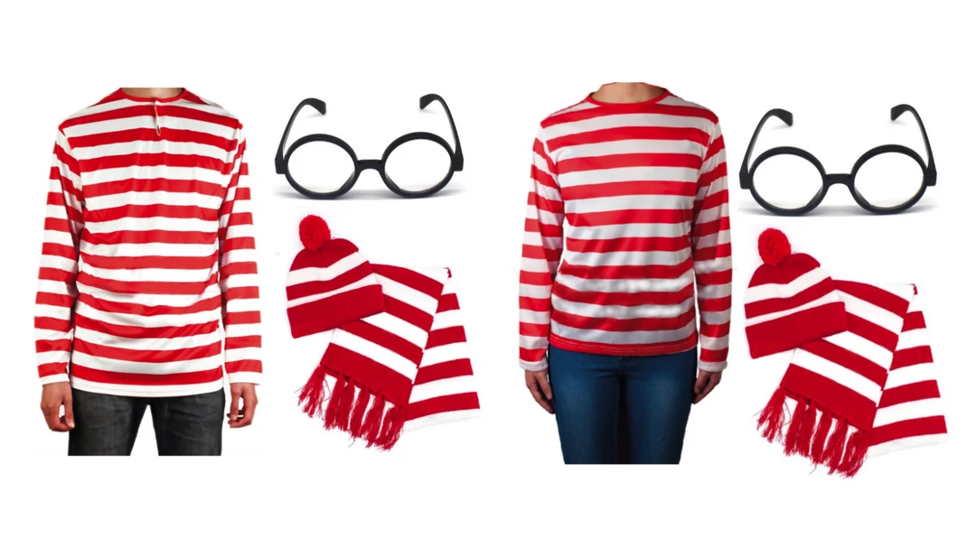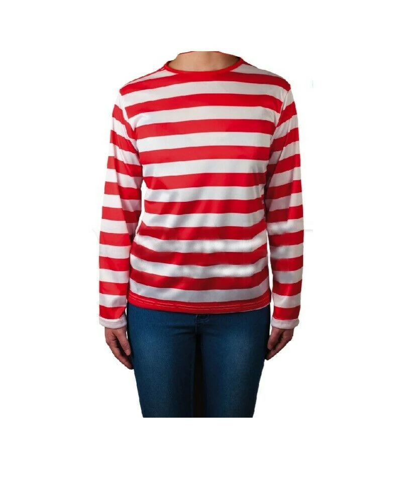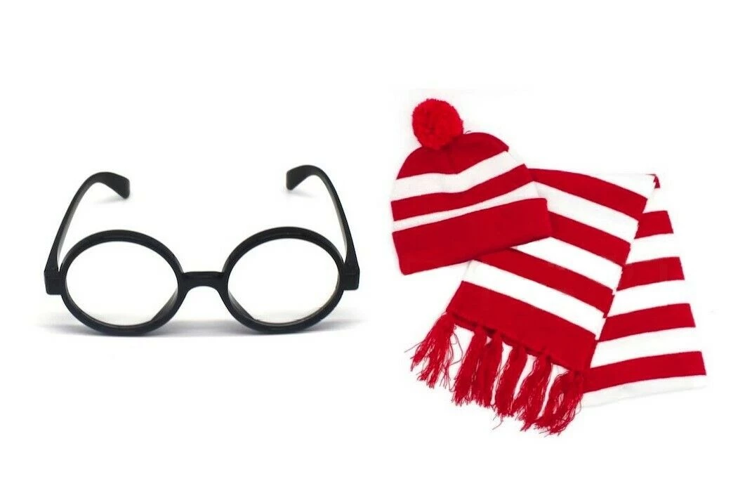 Look the part of everyone’s favourite Where’s Wally with these red & White striped costume sets. Shirt, Beanie Hat & Scarf and Glasses