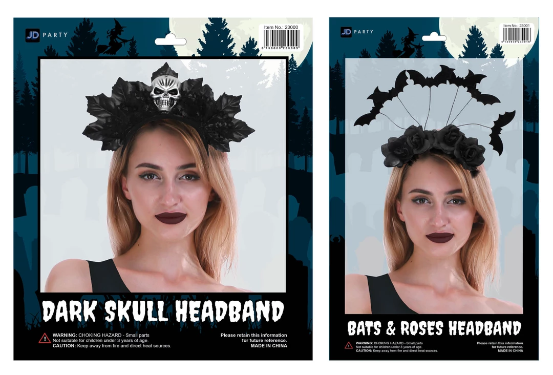 This Dark Skull Headband features a spread of black oak leaves with an ominous