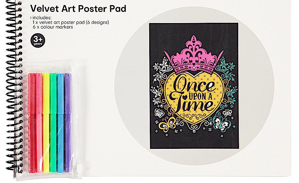 - Includes 6 x colour markers and 1 x velvet art poster pad (6 designs)