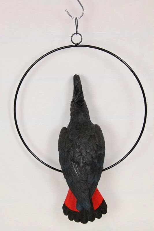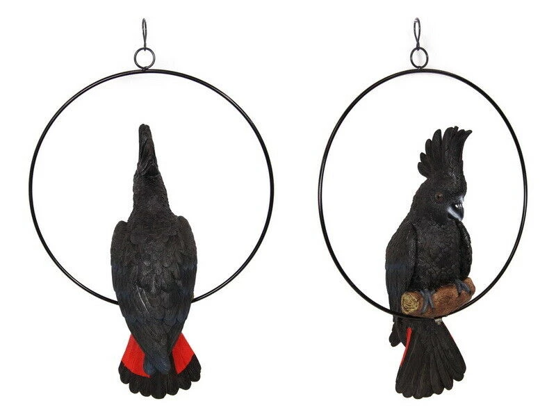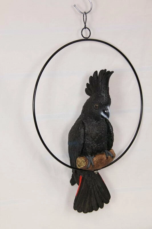This gorgeous hanging bird ornament features a stunning Australian Red Tailed Black Cockatoo Parrot in a 30cm metal ring. Sure to add some Australian character & charm to any garden or indoor/ outdoor area. Crafted from lightweight poly-resin, the bird is perched on a log inside a metal hanging swing. This black cockatoo features subtle blue markings on the wings and bright red panels on the tail which is a tell-tale characteristic of the adult male. The colouring and textures are very realistic.