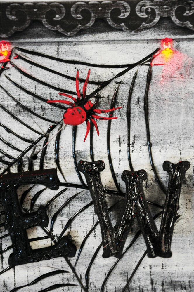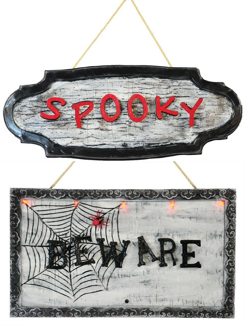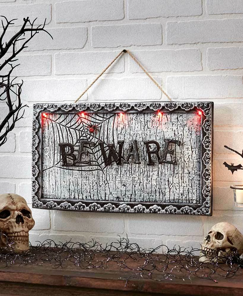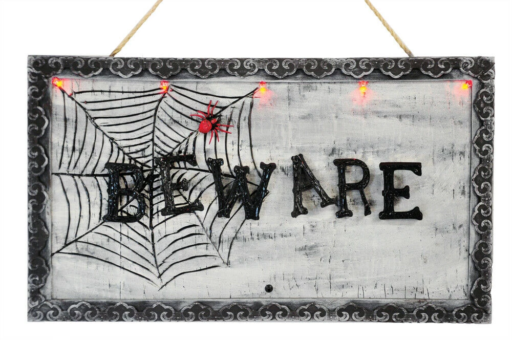 - The Halloween beware sign features weathered faux wood, a creepy spider on a spiderweb and 3D moving letters that spell out “Beware.”