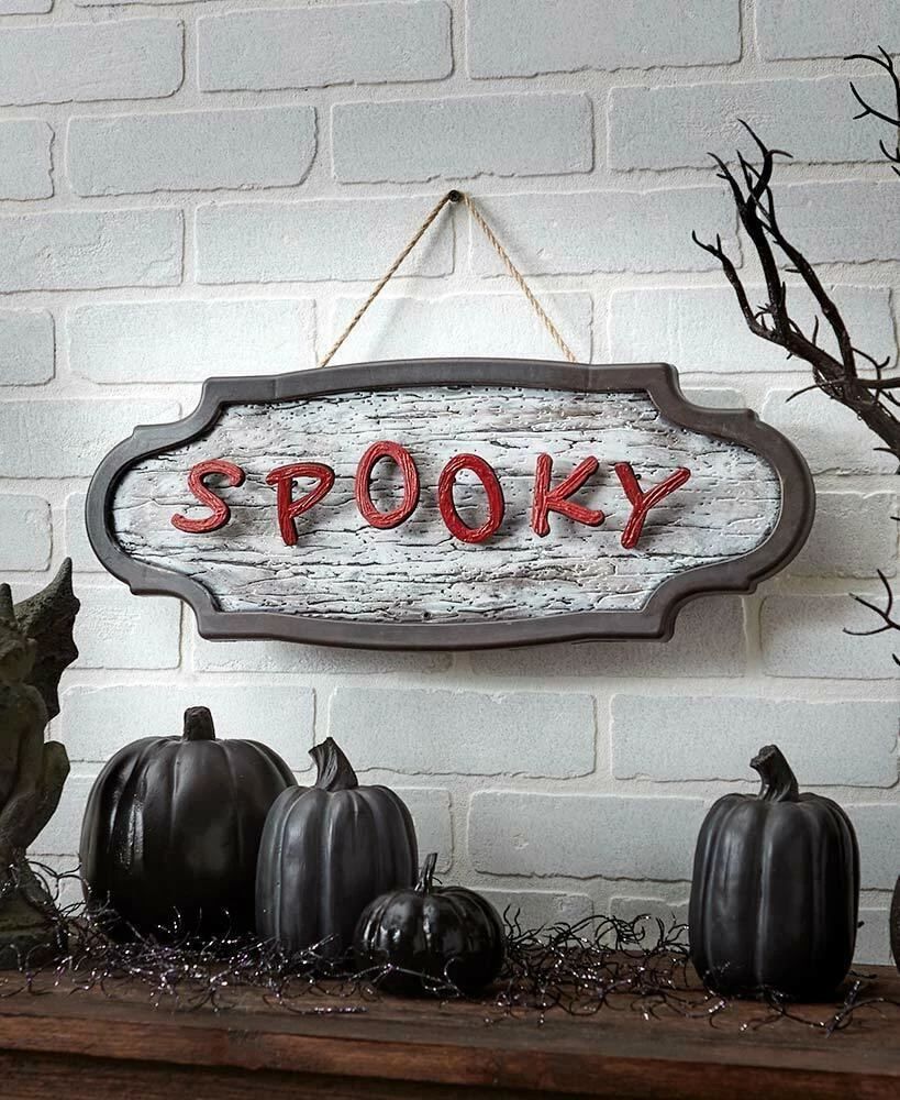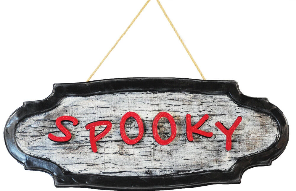 - This weathered faux wood sign with a black border also emits haunting sounds.