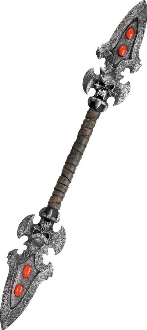 Includes: Plastic double bladed spear with metal-look skull detailing and leather-look wrap handle. It measures 48 inches long.