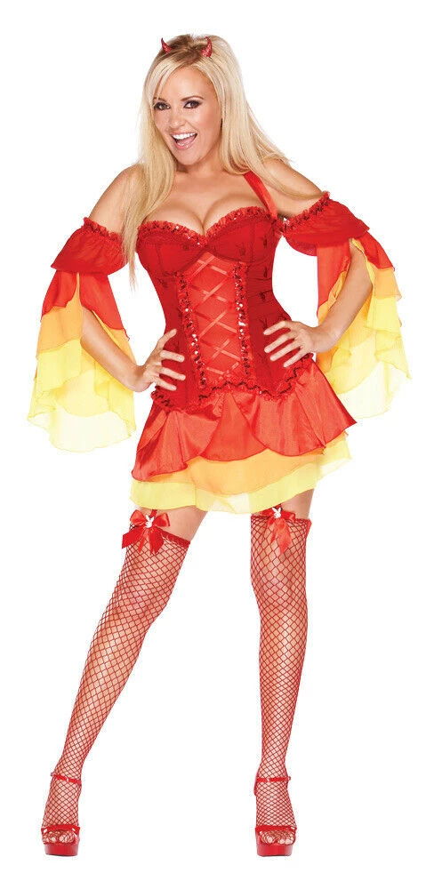 This sexy Playboy devil costume includes a corset dress, matching sleevelets and fishnet stockings. Playboy Rabbit Head embroidered gossamer corset dress with tiered, organza ruffled skirt and matching sleevelets. Fiery, sparkling clip-on horns, red fishnets with rhinestone accent garters.
