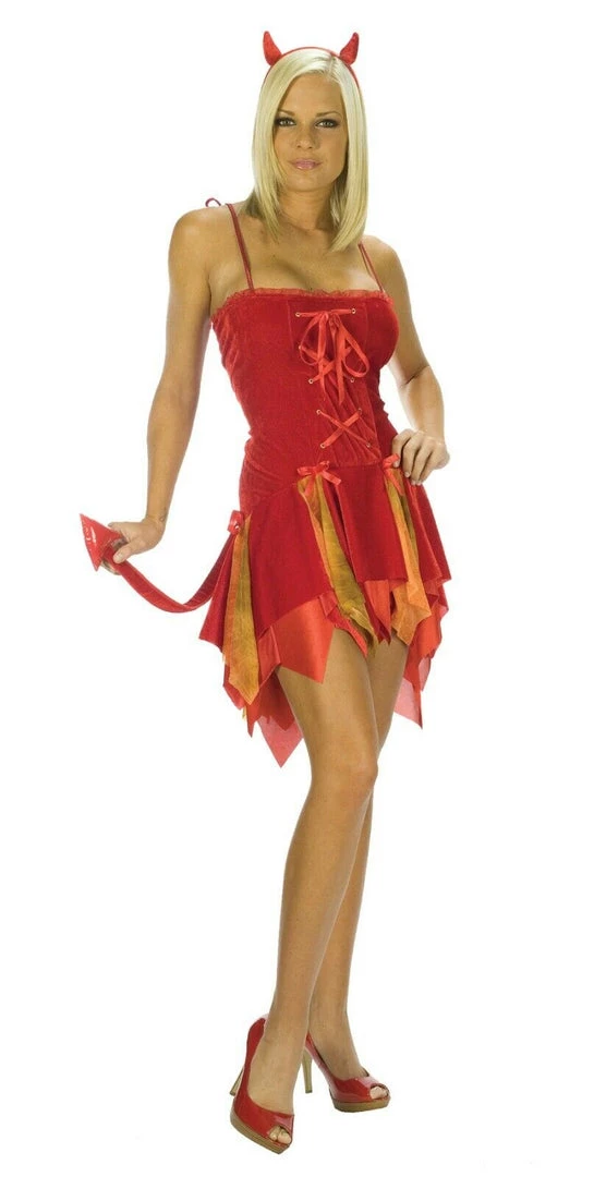 Tired of acting like an angel, now you can devil it up! Sexy Flirty Devil Women Costume includes lace-up dress with tie-dye skirt, tail and horn headband. This beautiful Sexy Costume is available in sizes: