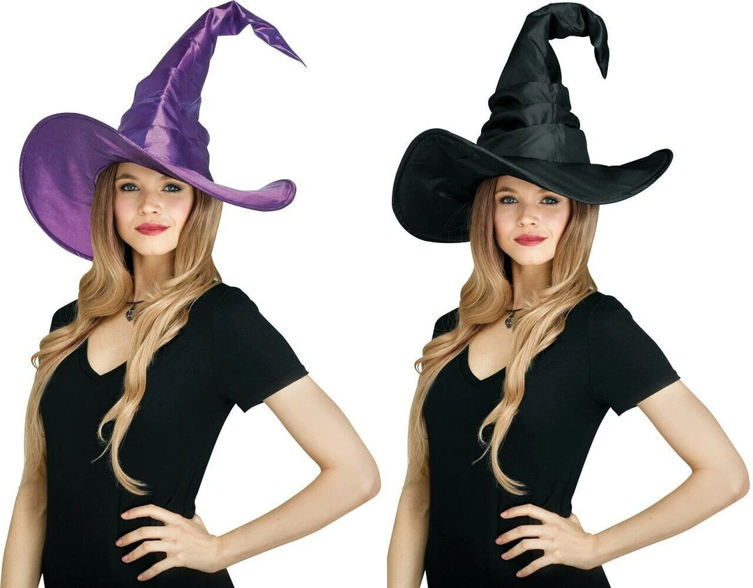Grab your broomstick and fire up the cauldron! This wicked hat will add a magical and enchanting touch to your witch or wizard outfit. The Adult Curved Cone Witch Hat by Funworld features a satin-look ruched witch hat with a large curved brim and crooked tip. One size fits most adults. This is a costume accessory. Not a toy.
