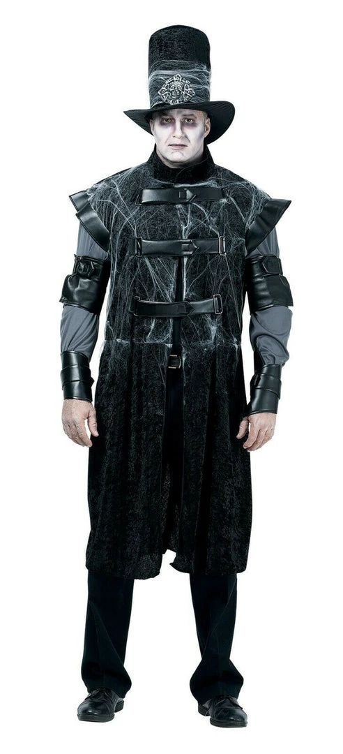 Such a ghostly sight that they will all fright. This drearily dapper costume includes a black felt top hat with a cobweb band and crested with a skull emblem in the front, an intimidating three quarter length hover coat that fastens with hooks and eyes, and tough looking armbands to match. Guaranteed to send chills done their spines on Halloween night!