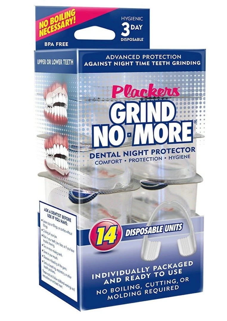 With an estimated 60 million adults affected by bruxism, more commonly known as teeth grinding or clenching, individuals may be affected by a variety of symptoms including worn tooth enamel, recessed gums, increased tooth sensitivity, jaw pain, earaches and headaches. Plackers Grind No More Dental Night Protectors meets the demanding needs of both ‘clenchers’ and ‘ grinders’. The bite plate alignment grooves, absorbing bite plates, and stabilizing bite plate lips work together for maximum protection, exceptional comfort and hygiene. The streamlined, one size fits all Grind-No-More Dental Night Protector is designed to be worn on either your upper or lower teeth, whichever is the most comfortable for you. Each Grind-No-More Dental Night Protector is designed to be used for up to 3 days ‘ it’s clean, fresh, and hygienic