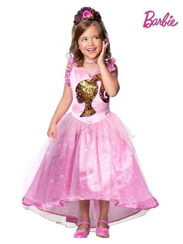 - Satin dress with iconic Barbie logo in glittery gold sequin design on the bodice plus organza peplum embellishment on the skirt and printed details
