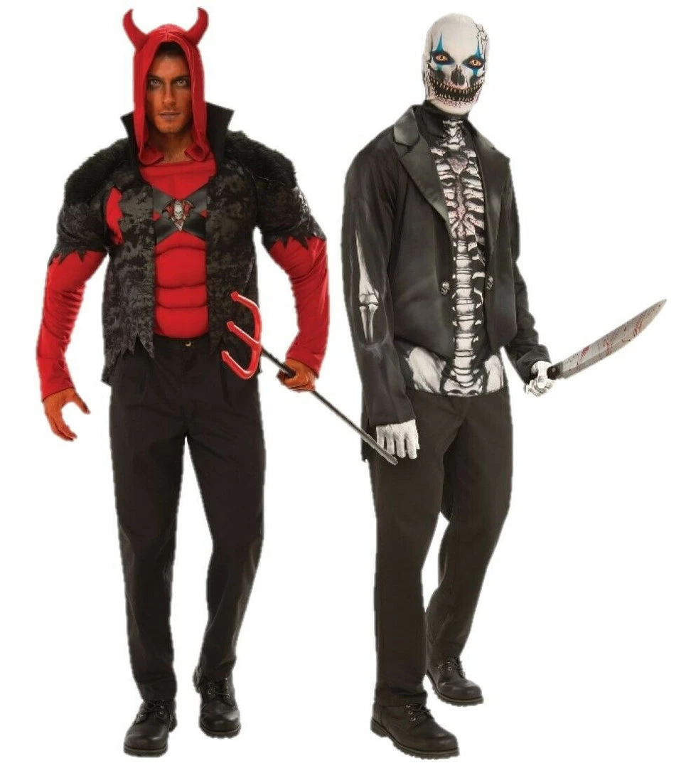 - Costume top with fibre filled muscle chest and stitching detail, plus faux leather attached harness with shaped and printed character pendant