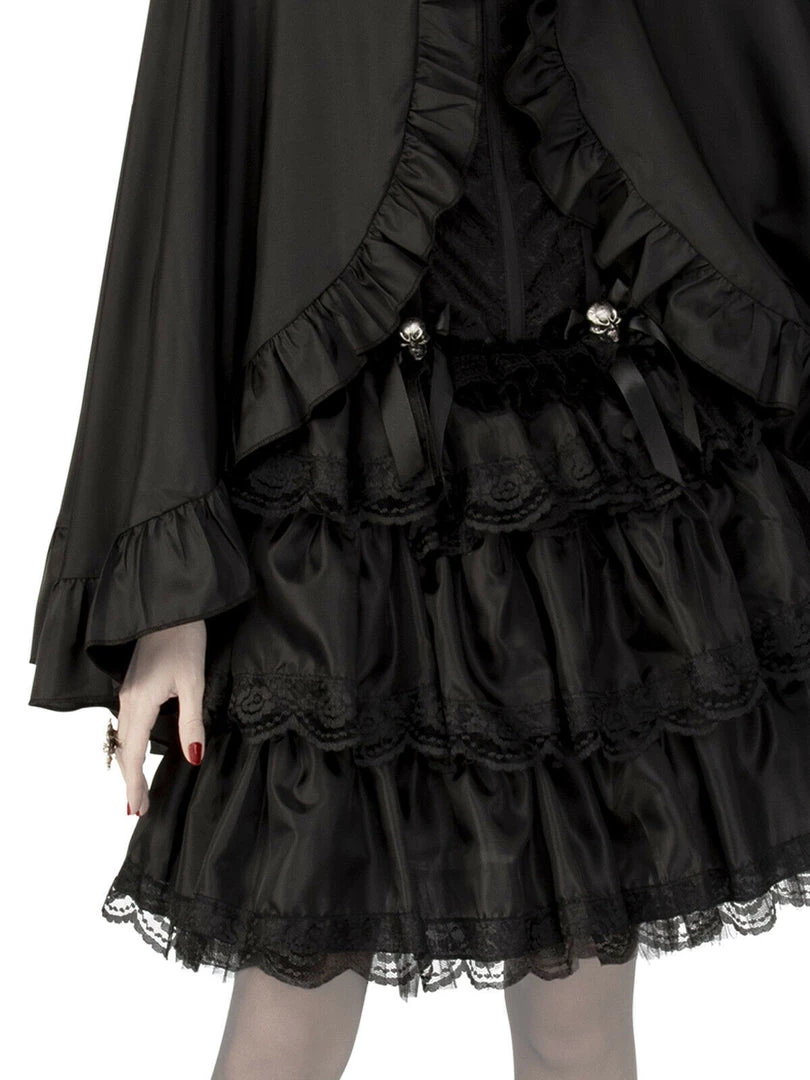 - Cape has scalloped edge and frilled trim and a feature high collar