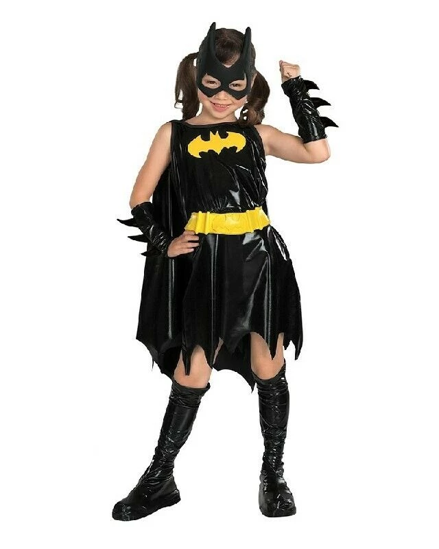 - Dress in vinyl look fabric with bat emblem printed on chest plus scalloped hemline on skirt