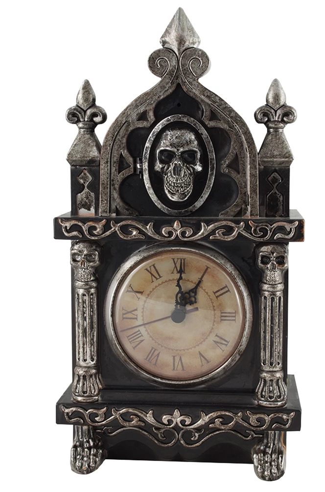 sound activated antique style clock with a skull face on top.
