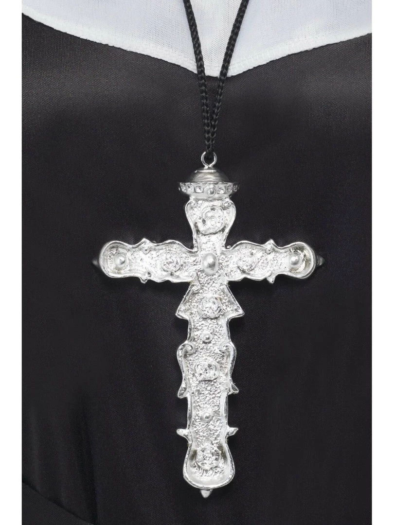 with this adult’s ornate silver cross Halloween jewelry. This ornate cross is a