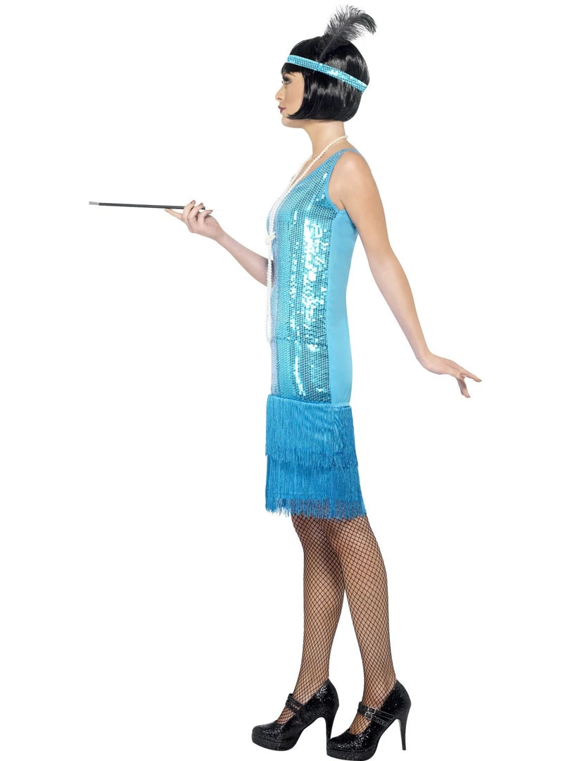 Flirt your 1920’s style in Flirty Flapper Costume with Teal Dress, Headpiece and Necklace.