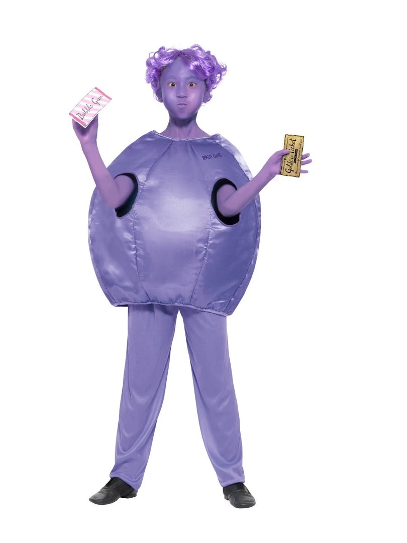 From Roald Dahl’s classic children’s story Charlie and the Chocolate Factory comes this Violet Beauregarde costume for children. Dress up like Violet as a giant blueberry after she ignores Willy Wonka’s instructions. Costume includes padded round purple top, matching purple pants, bubblegum prop and Golden Ticket. Purple face and body paint and wig sold separately. Dress up in this costume for Book Week and Find Your Treasure.