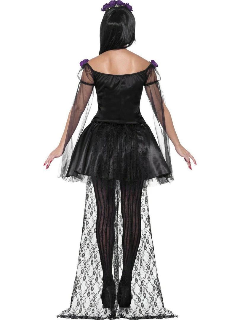 - Purple floral Day Of The Dead black stretch top has flowing sleeves with attached purple roses at the top of the shoulders. A gathered bust line and printed skeleton rib cage feature on the front of the top. Top is designed to be worn slightly off the shoulder.