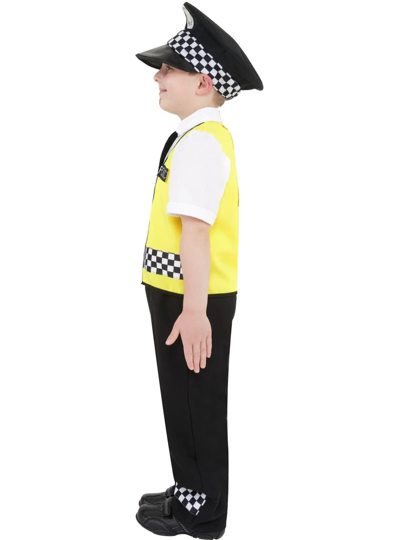 - The costume has a yellow front which looks like a vest with black trim, black and white checks plus ‘Police’ printed on one side.