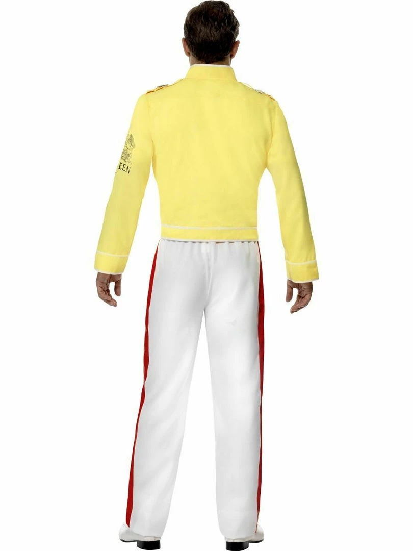 Our Adult Economy Freddie Mercury Costume inspired by Wembley ’86 comes complete with Yellow Jacket with Belt Ties and White Trousers with Red and Gold Stripe.