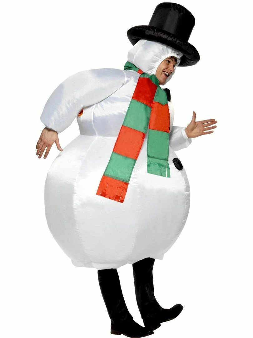 Get into the festive spirit this Christmas with adult men’s inflatable snowman fancy dress costume which comes complete with a white inflatable bodysuit which features a large black top hat, a green and red scarf and a self inflating fan. Instructions are included. Frosty the snowman was a jolly happy soul!