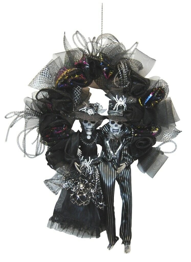 - Wreath has a cute plastic skeleton couple sitting on the inside, one wearing a suit the other wearing a dress.