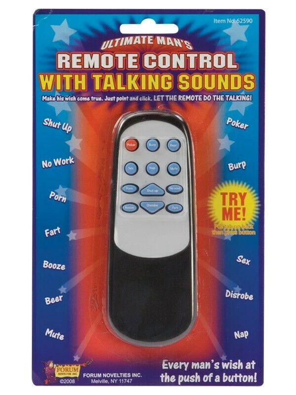 The Ultimate Man’s Remote Control features twelve command buttons that allow men to let the women in their life really know what they are thinking! With command button selections such as Mute, Beer, Nap, and Disrobe you will have no problem letting this remote do all the talking for you! The Ultimate Man’s Remote Control makes a perfect gag gift for any man’s Bachelor Party, Over the Hill Celebration, Birthday Present, or Stocking Stuffer!