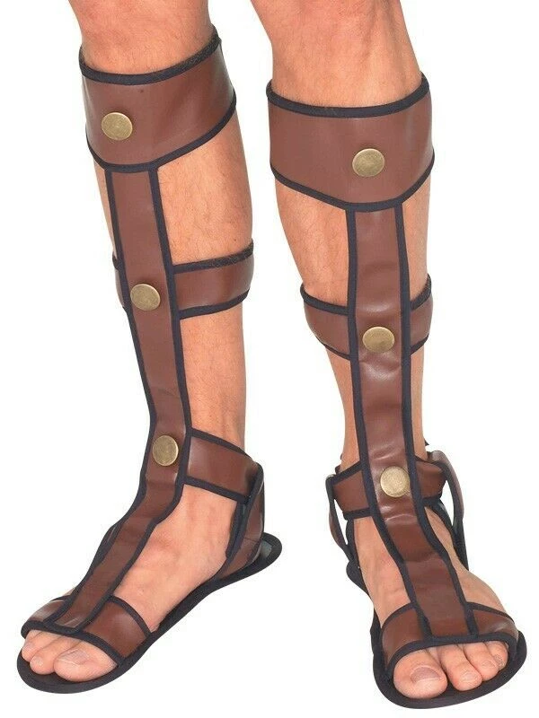 Want to be the ultimate warrior this Halloween? Get the Gladiator Sandals for Men and kick butt in ancient times! These masculine brown faux leather sandals are trimmed in blue and adorned with gold studs. The straps of these sandals climb your calves, making them both stylish and protective. Be brave and bold in the gladiator sandals!