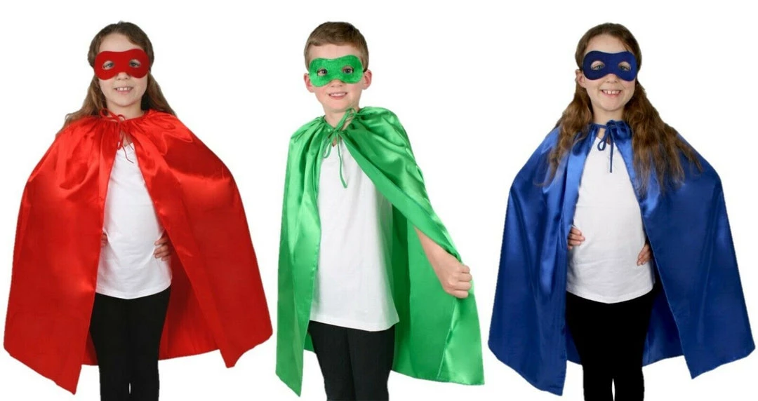 This Super Hero Satin Cape with Eye Mask Child set includes a the cape and mask and is designed to fit most children over the age of 3.  The various colours can be chosen to suit your little one’s fantasy super hero of the moment.