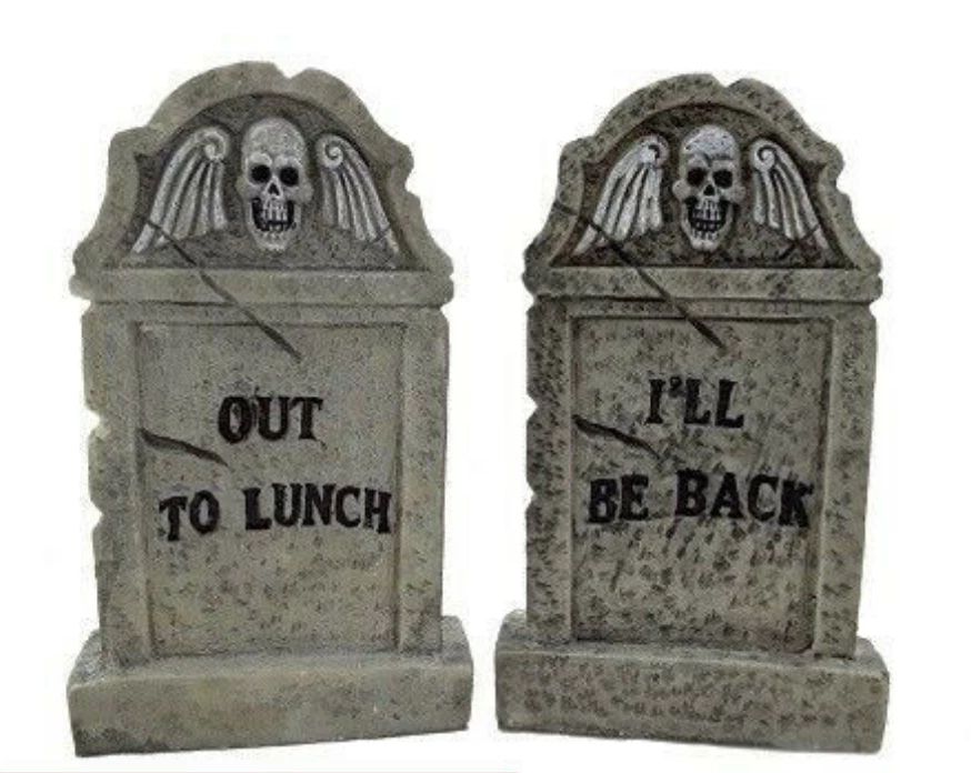 tombstone Halloween props come in two designs, Out to Lunch and Ill Be Back.